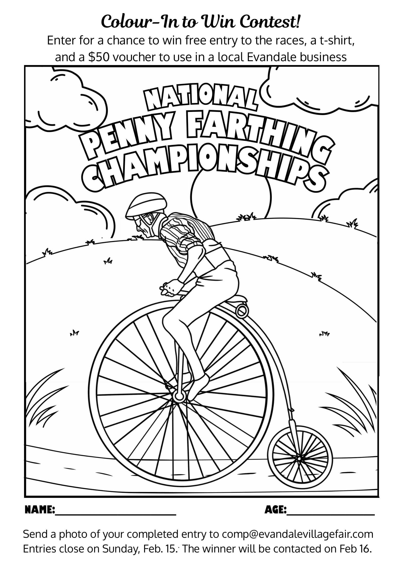 Simply download and colour in the 2026 event Penny Farthing Artwork Here, add your name and age, then send a photo of your finished masterpiece to comp@evandalevillagefair.com.